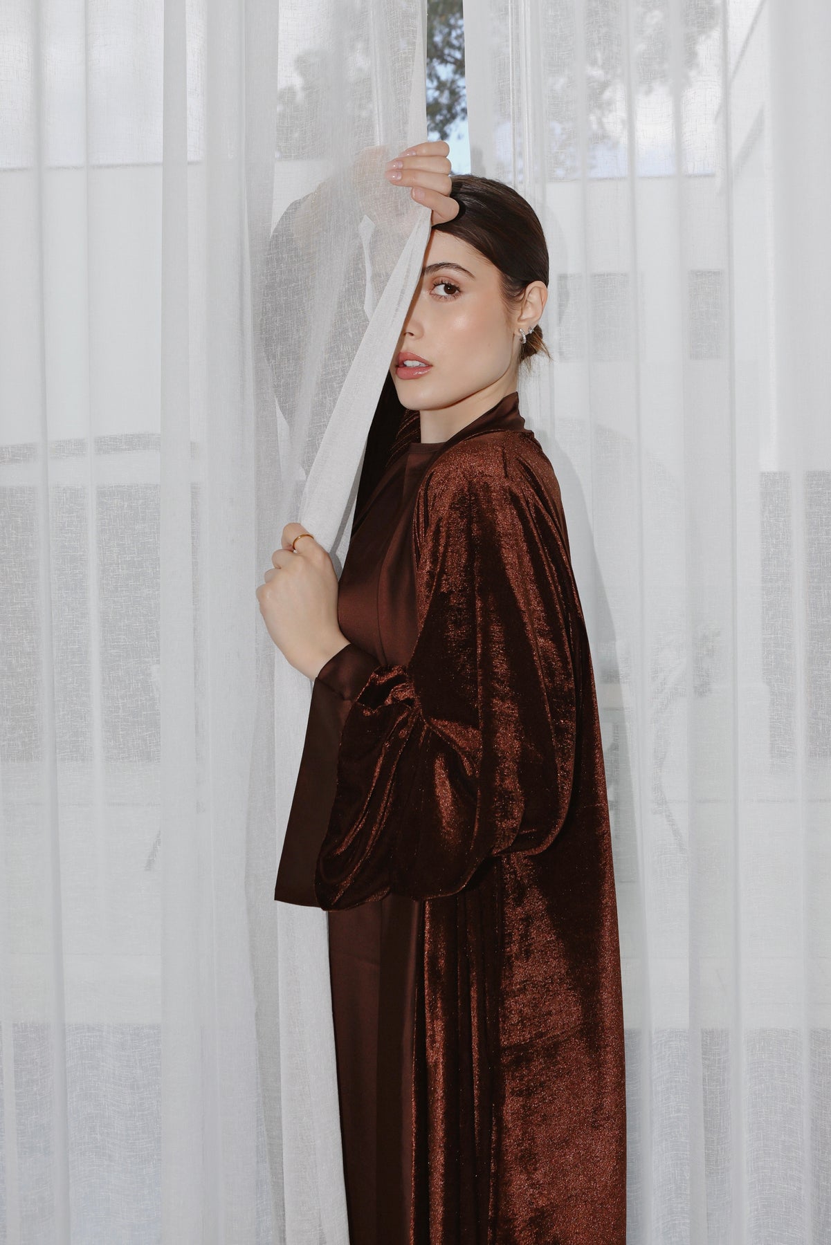 This Velvet Abaya is a celebration of effortless elegance. Crafted from lightweight velvet that drapes gracefully without feeling heavy, it comes with a satin inner slip for a refined finish and a matching chiffon hijab. Satin paneling runs delicately along the front and sleeves, adding a subtle sheen that elevates the design. Designed to move with you, it blends comfort and sophistication — a timeless choice for moments when you want to feel both modern and unforgettable.