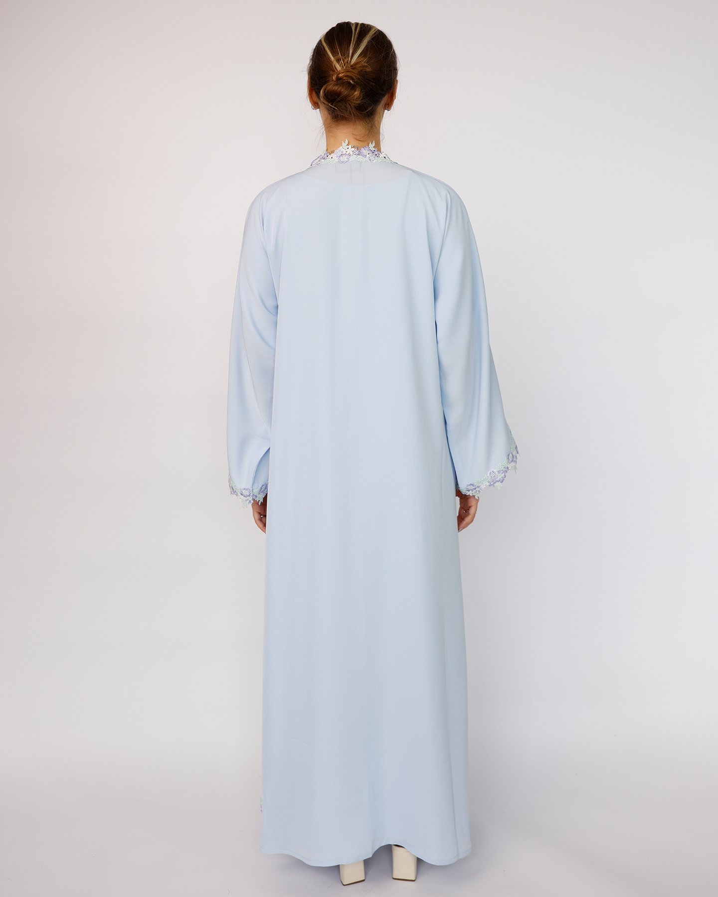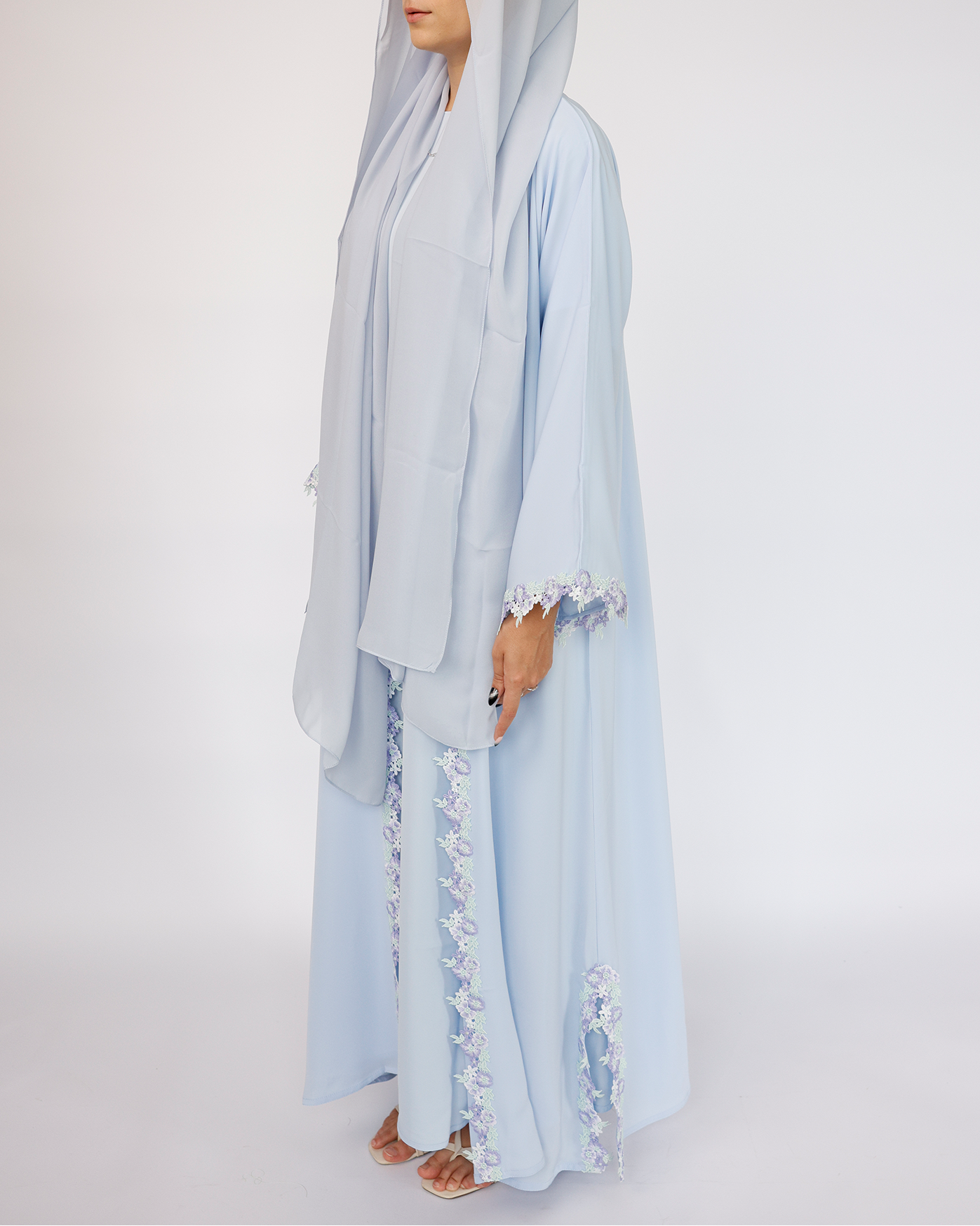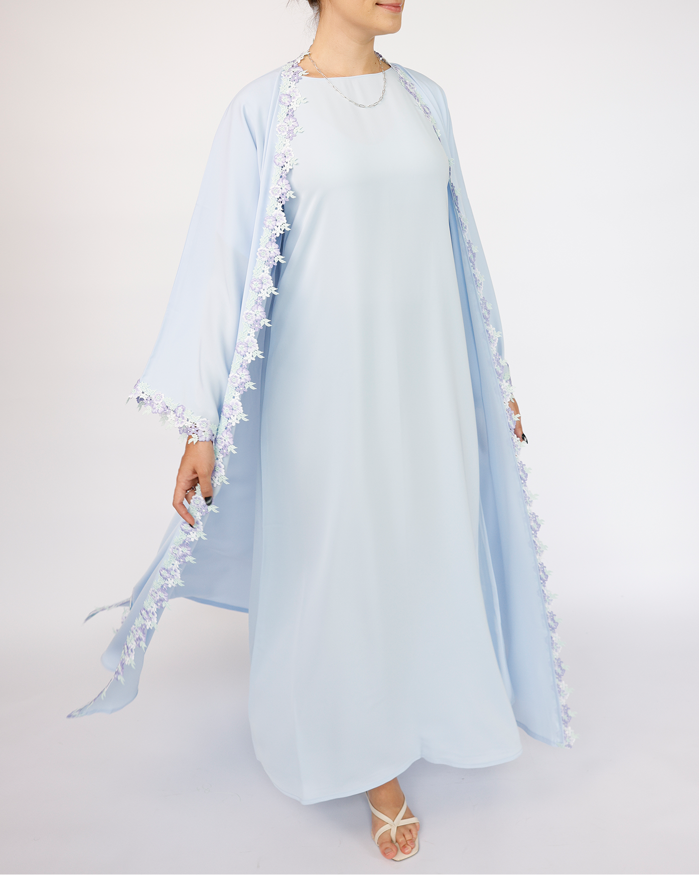 This three-piece set includes a matching inner slip and chiffon hijab for a complete & elevated look.