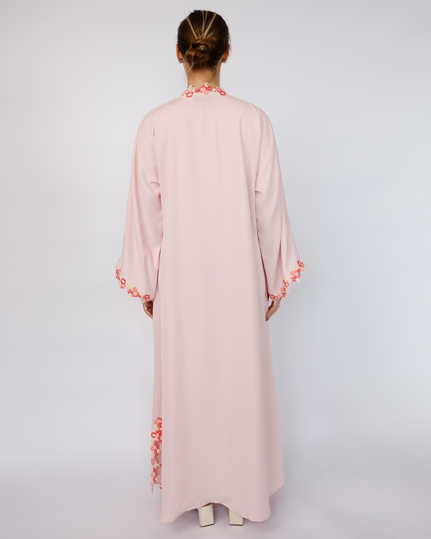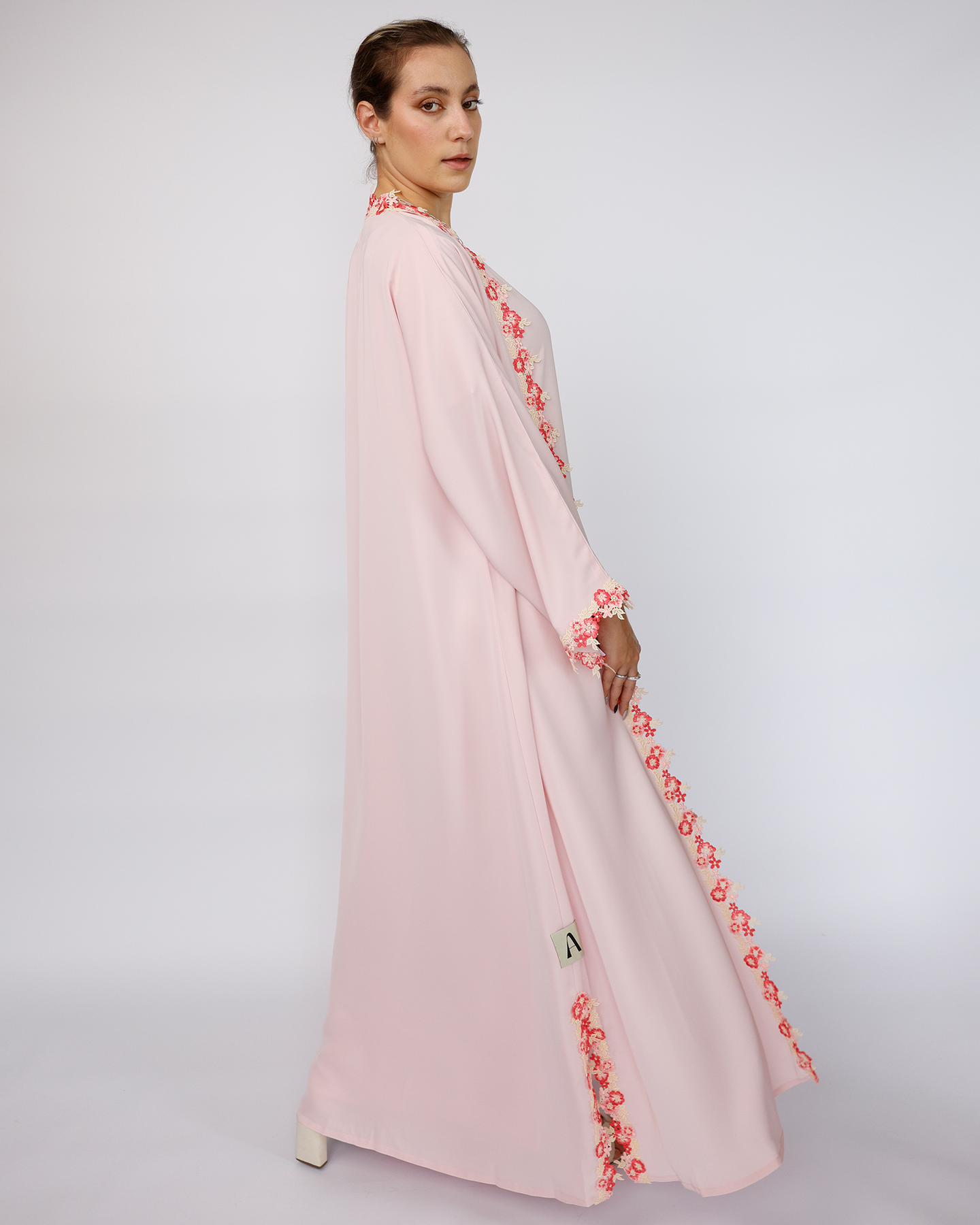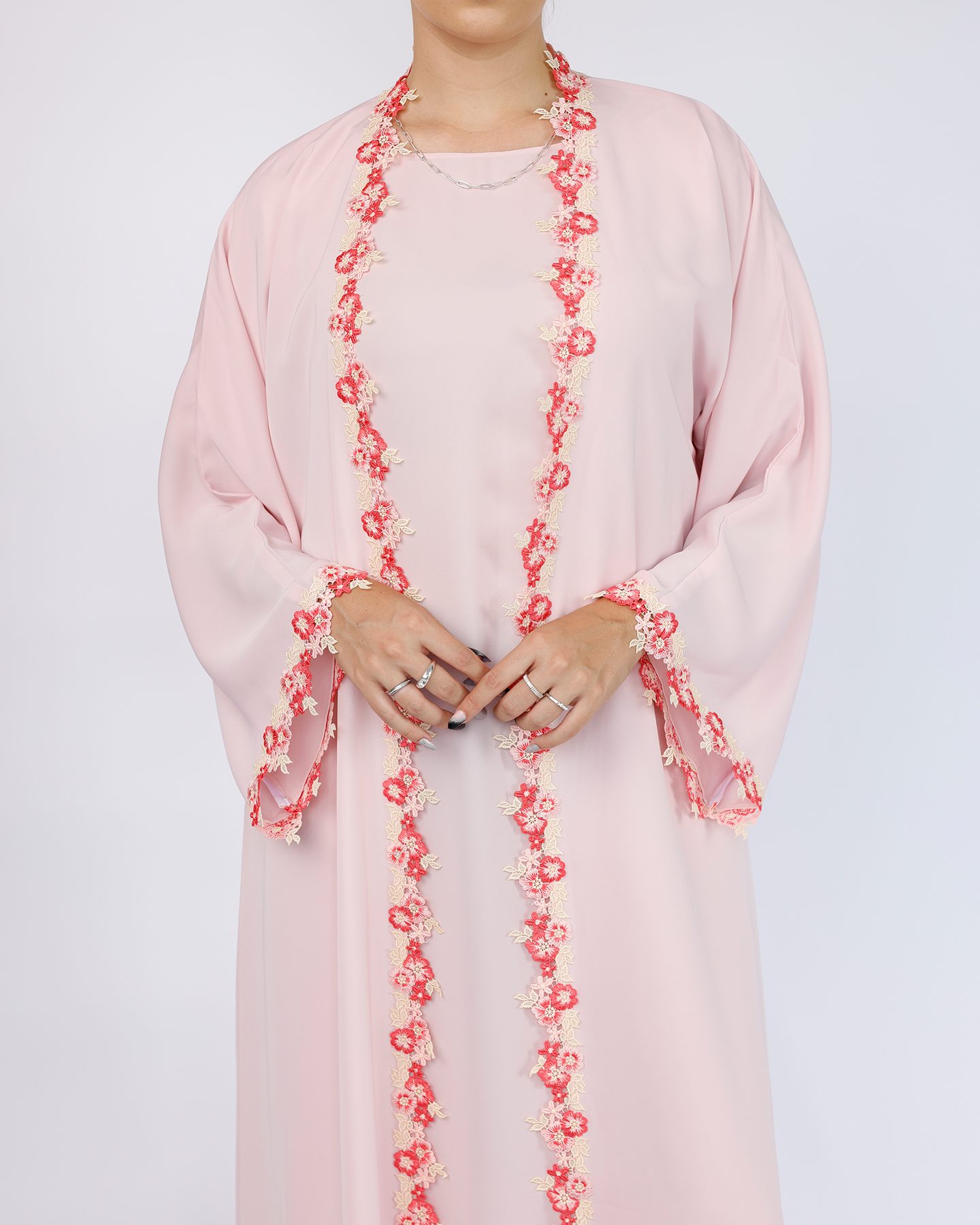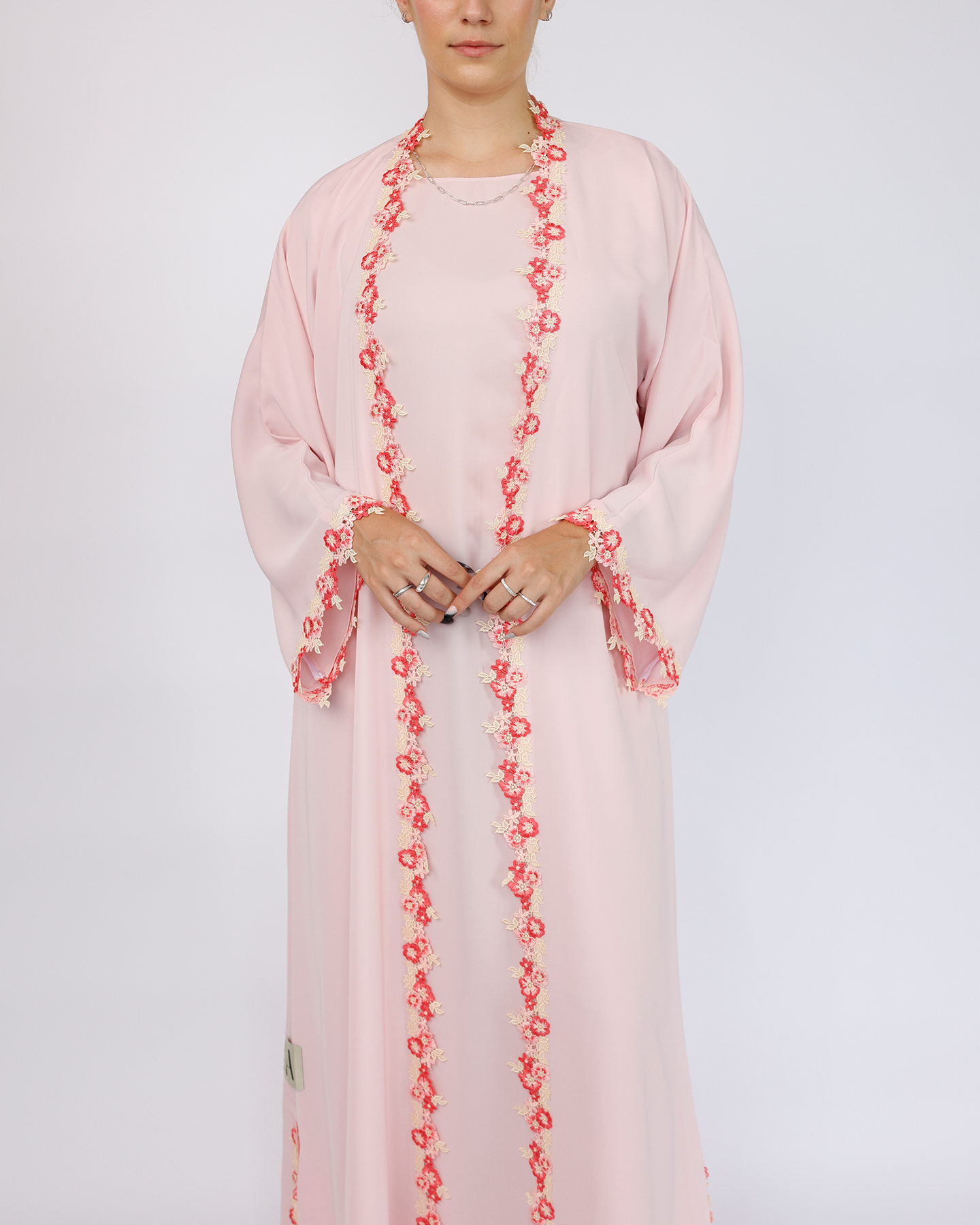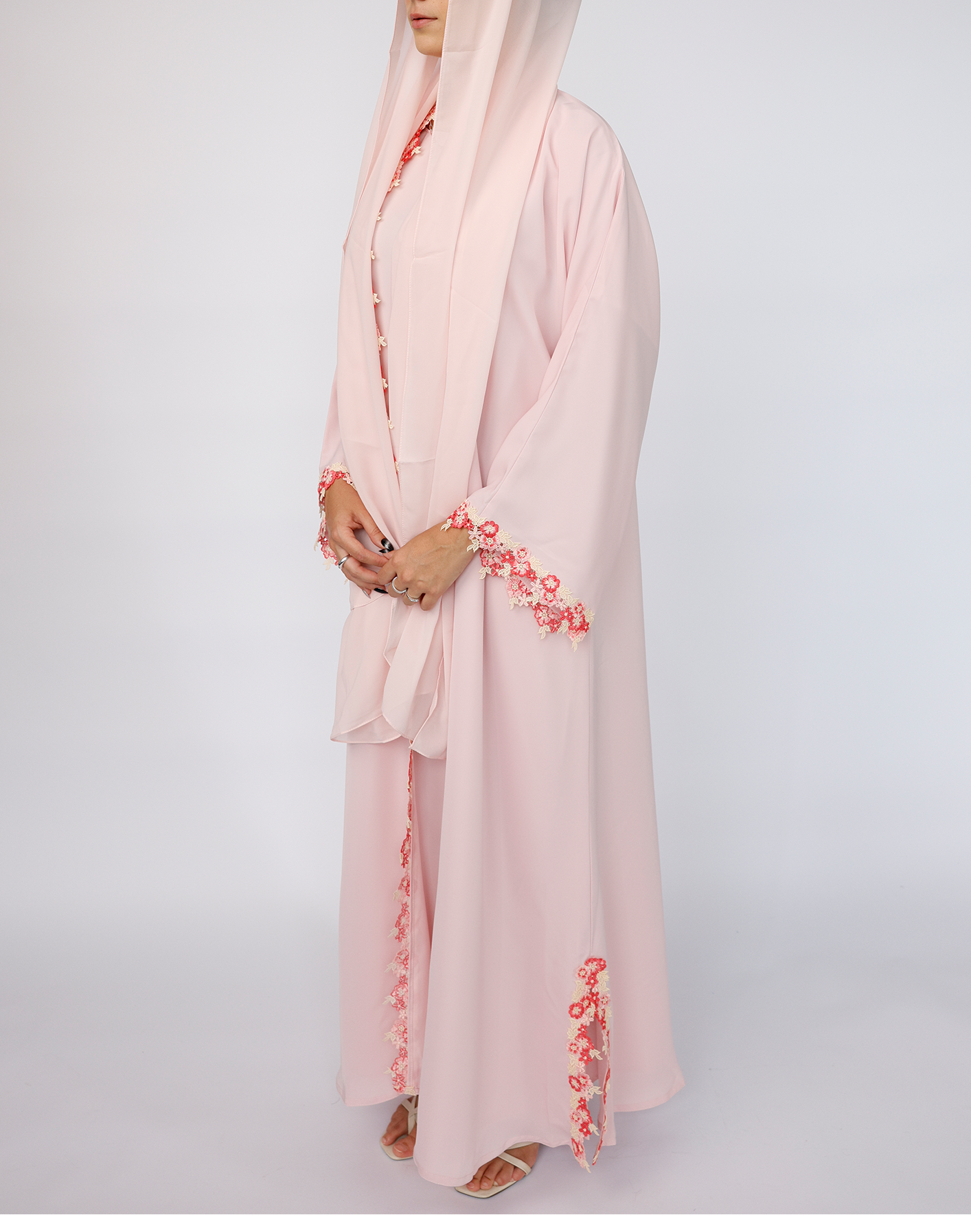 This three-piece set includes a matching inner slip and chiffon hijab for a complete & elevated look.