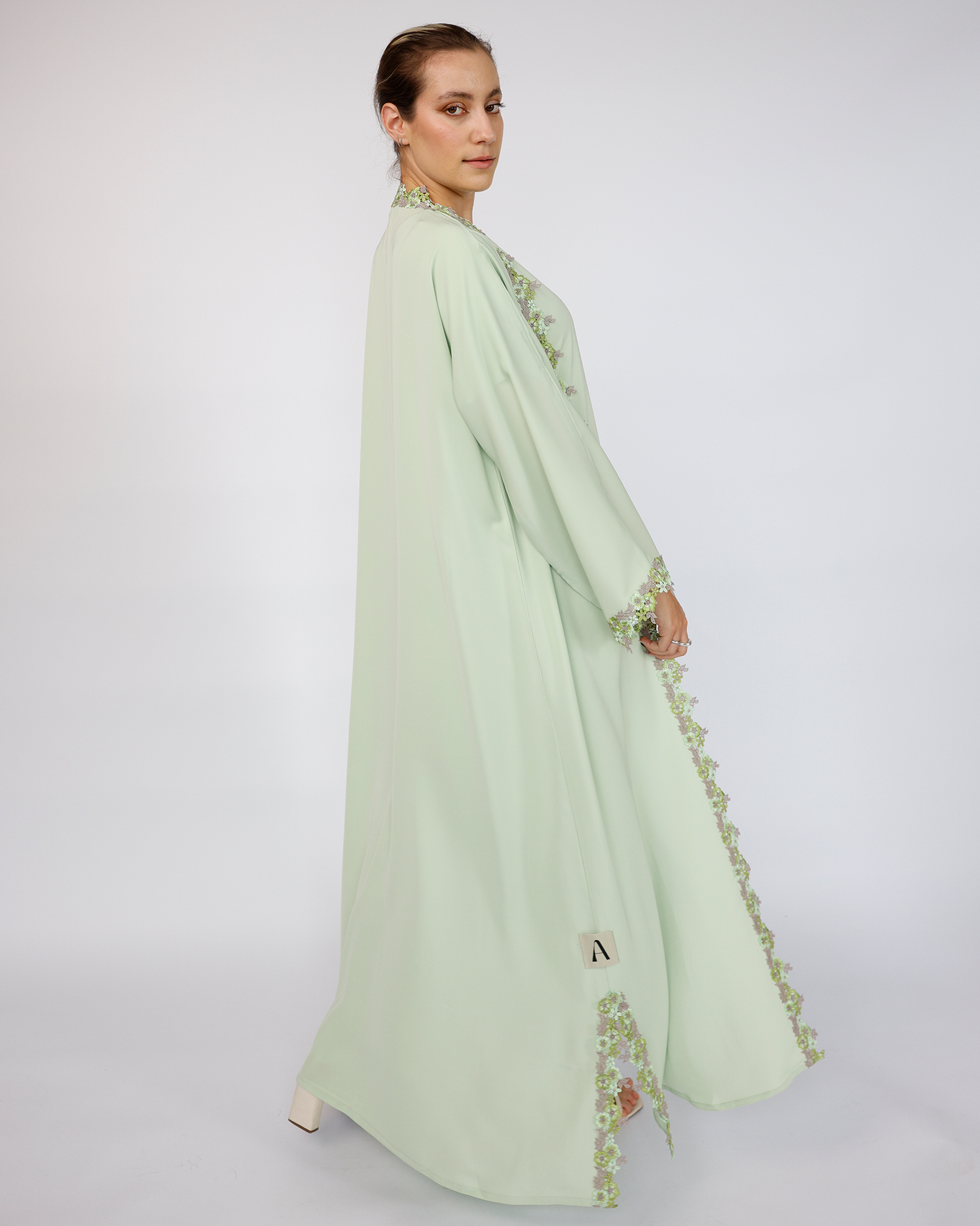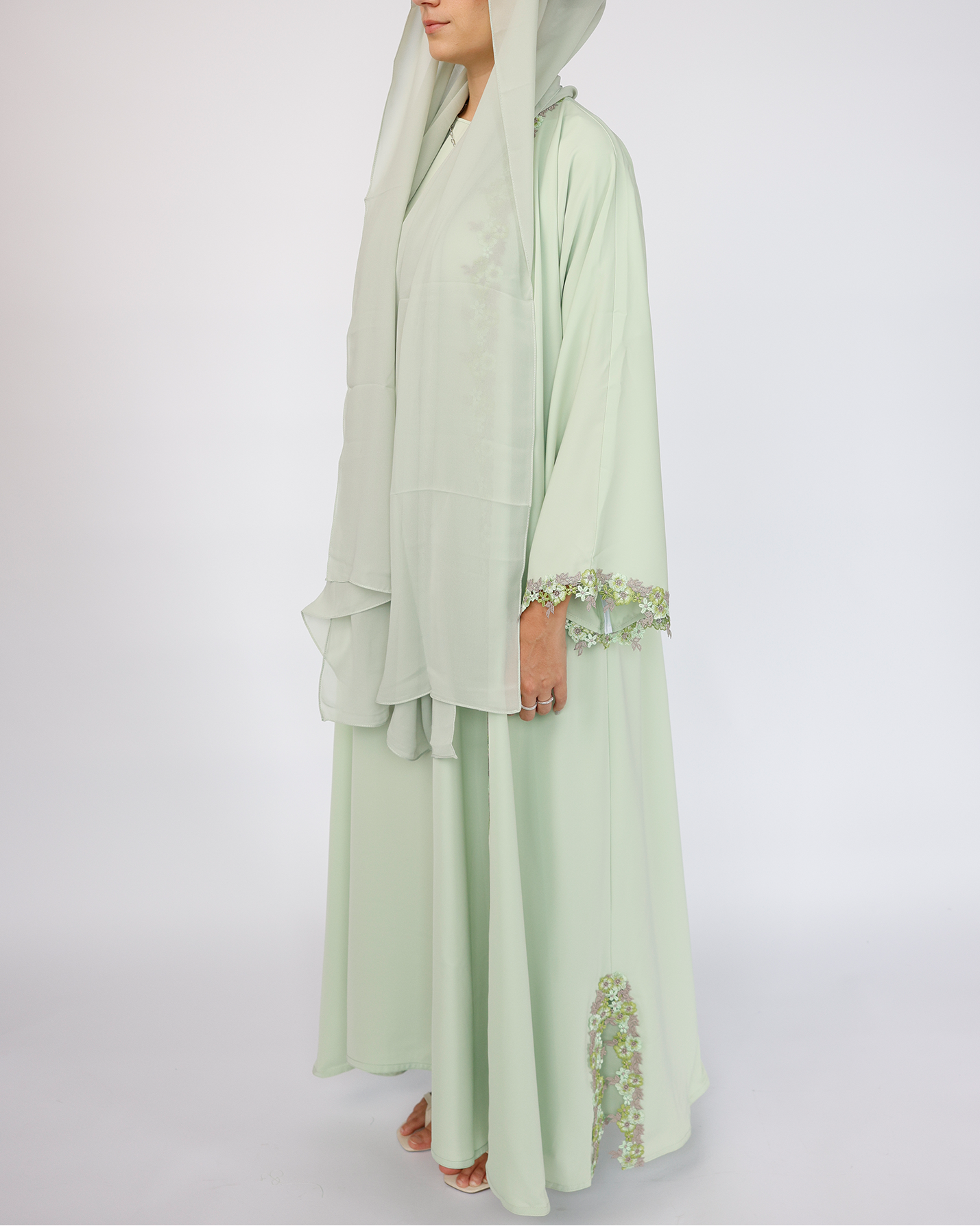 This three-piece set includes a matching inner slip and chiffon hijab for a complete & elevated look.